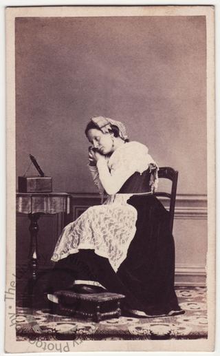 A girl from Valmontone, in the region of Lazio, wearing the traditional costume of her region. She is posed seated at a mirror in the act of fixing an earring. Photographed by Sommer and Behls of Naples and Rome.