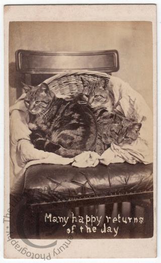 A carte de visite showing three cats in a basket, with a birthday greeting written on the negative.